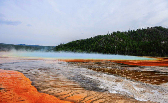 大棱镜,黄石公园里最有名的间歇泉之一,是美国最大的温泉,世界第三大温泉。因其多彩的颜色,而被命名为“大棱镜”,从里向外,分别呈现出蓝、绿、黄、橙、橘、红等不同颜色,被誉为“最美的地球表面”。大棱镜周围建有行人木栈道,一圈走下来,大概需要40分钟。我们第三天趁天气好,又重走了一次大棱镜。