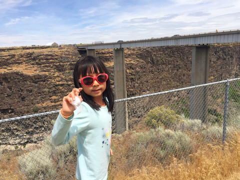在快到达肖肖尼瀑布时,我们经过了Perrine Bridge铁桥,这是一座有历史故事的桥梁,桥头有这座桥的建设史。我们小三口,在这里看到满眼金黄的天地,于是索性下来溜溜,只见铁桥下面是很深的峡谷,幸好有铁丝网拦住,我们可以安全放心地观看。