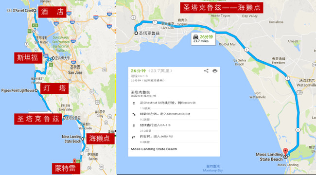 离开斯坦福大学,很快就进入了一号公路。一号公路号称是世界最美的自驾公路之一,一边是壮阔美丽的太平洋,一边是高高耸立的落基山。路的两边景色层次丰富,既有壮美蜿蜒的海岸,也有绿草茵茵的牧场,还有极具特色的小镇;既有懒洋洋的海狮海豹,也有活泼可爱的松鼠海鸥,还有不惧风险的冲浪勇士。