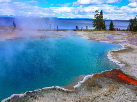 游览完老忠实喷泉,继续前行,来到黄石公园我们计划的最后一组景点——西拇指喷泉和黄石湖。西拇指喷泉和黄石湖位于公园东南边,湖中热泉是此处的特色,喷水口从湖底汩汩出水,暗黑、透明绿、宝石蓝,颜色丰富多彩,除了五颜六色的间歇泉,旁边的黄石湖和远处的雪山交相辉映,若天气晴好,更是难得的好风景。黄石湖如同大海般开阔,是“美国最大的高山湖泊”。湖水清澈透明,湖光山色,湖面与远处的雪山遥相呼应,极其秀丽!