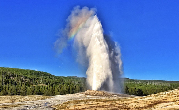 老忠实喷泉,因其始终如一的有规律地喷发而得名,目前大约每隔93分钟喷发一次,刚开始喷发时,地下发出轰隆声,几分钟之后,水流撞击地面的声音,再最后喷薄而出,每次喷发持续四至五分钟,水柱高达40多米,蔚为壮观,而且从不间断。