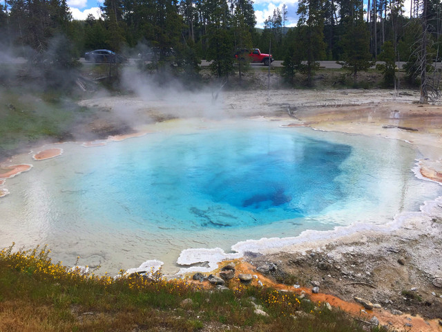 6月14日早上,蓝天白云,天气晴朗,办理完退房手续,立即出发。今天我们继续沿8字下半部走,由于第一天下午天气一般,我们今天把原来的游过的豆浆池和大棱镜重新打一下卡。游览第一天走过的景点,行驶近两个小时,我们来到了老忠实喷泉。