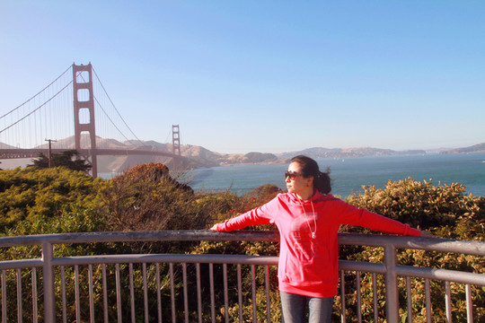 在渔人码头玩了两个多小时,我们打车来到金门大桥。金门大桥是旧金山的象征,它橘红色的桥身使得整座桥有着超凡脱俗的外观,它被国际桥梁界广泛认为是美的典范,它也是世界上最上镜的大桥之一。金门大桥,风通常很大,冰凉的海风不仅吹得你头发凌乱,而且吹得你脑瓜子生痛。