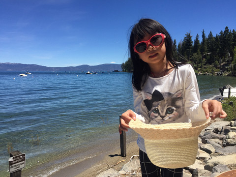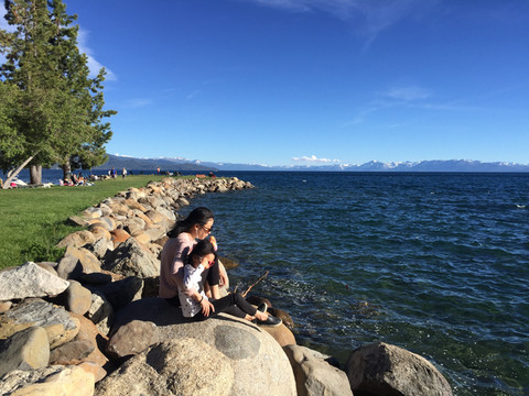 我们第一站来到太浩湖的水晶湾,此时天色正值下午,阳光温暖,湖风习习,湖边非常舒服安逸。这里是当地居民的休闲场地,有大型停车场,还有小朋友玩的沙池。岸边有很多居民或在晒太阳,或在进行各类水上运动。