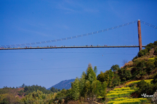 村落外是漫山遍野的油菜花海,从索道上站出发,经由春、夏、秋、冬四个亭子和水口红豆杉林,到达1号观景台,便可俯瞰那万亩梯田花海。前方不远处是卧云悬索桥,只见长桥卧波横空,其长约数百米,直达山谷两端。桥下溪水潺潺,吊桥中间有两块透明的玻璃板,徒步其上,恰逢谷中清风吹拂而来,飘飘乎直欲羽化登仙。吊桥后面便是2号观景台,这边除了梯田和花海可以拍照,附近还新开发了溜索等体验项目,感兴趣的可以去尝试一二。