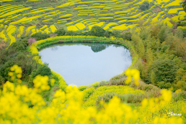 花间还有半亩心形的塘,犹如一颗宝石点缀在那片金色的海,晴天时倒映着碧空如洗的蔚蓝,阴雨天也有烟雾缭绕,不论天气好坏,自有千般风情。