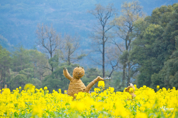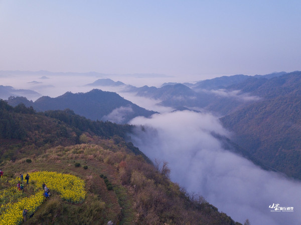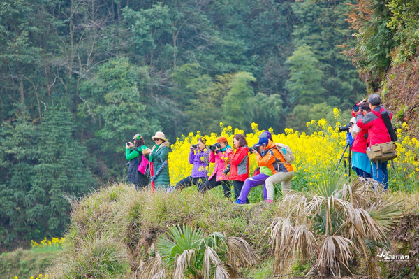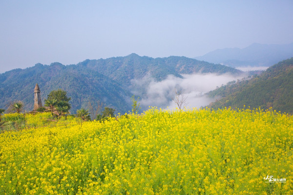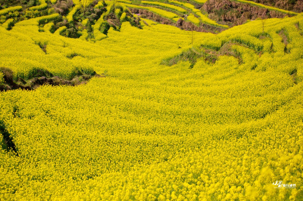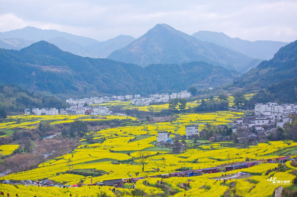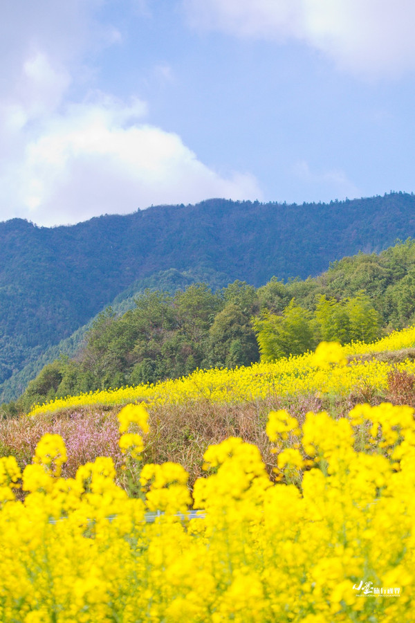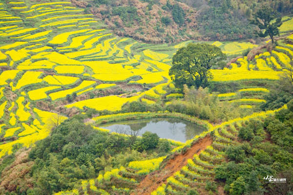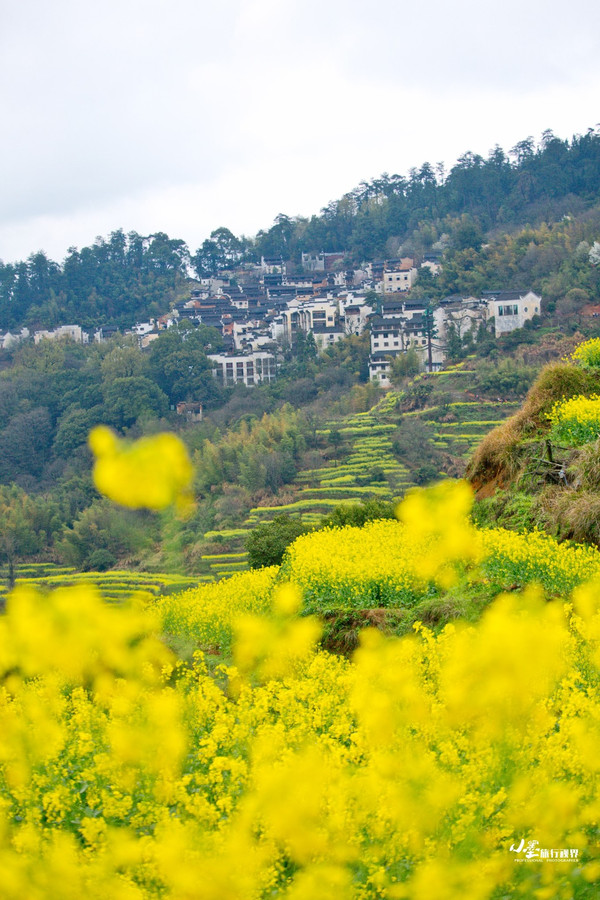 和篁岭类似,江岭的油菜花也是呈梯田状铺散在广阔天地间,缠山绕岭,层层叠叠,如梯入云,高低错落。登高望远,远山似眉如黛,花径如胭如脂,金花绿叶间点缀着几处灰瓦白墙的徽派村落民居,一阵清风过,带来山间飘动的雾霭流岚,好一幅天然的泼墨山水。