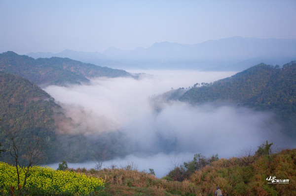 查平坦的云海最壮观的时候即是太阳初升自背后的山峰,将万丈金芒打到远方波澜壮阔的云海和眼前的油菜花海上,给苍茫肃穆的天地涂上了灵动的色彩。