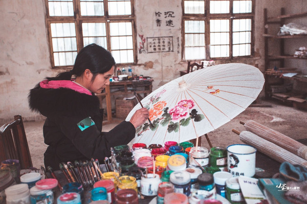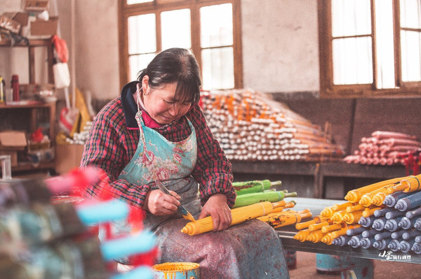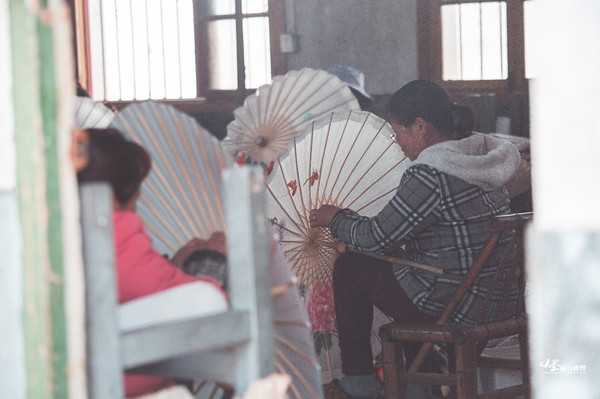 制伞工人们耐心细致地打磨伞骨,安装伞面,修边,暴晒,上色,绘图,上油,风干,最终绽放成手中的一道风景。