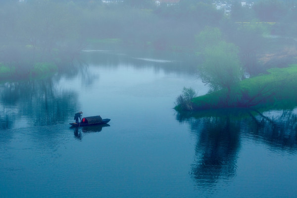 乘着第一缕晨曦奔赴月亮湾,清晨时分,晨雾如轻纱般笼于水面之上,白墙,黛瓦,金花,绿水在一片烟水迷离的朦胧中亦幻亦真,船夫撑着竹筏泛舟湖上,间或抛撒的渔网被晨曦染成金色的雾,置身其中,好似立足于一卷泼墨山水画内,而更深更远的地方,依稀笼罩在无边丝雨细如愁的梦境之中。