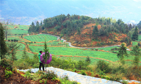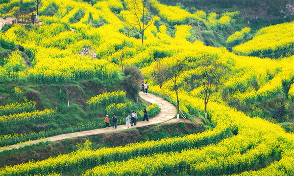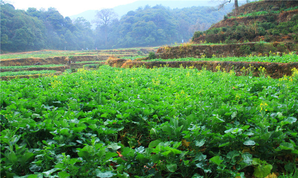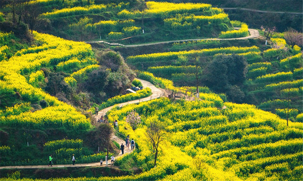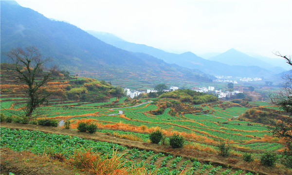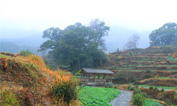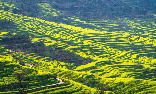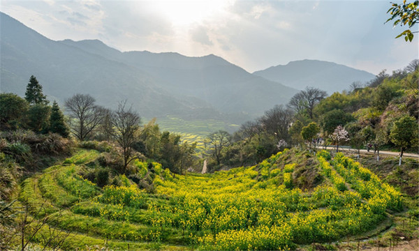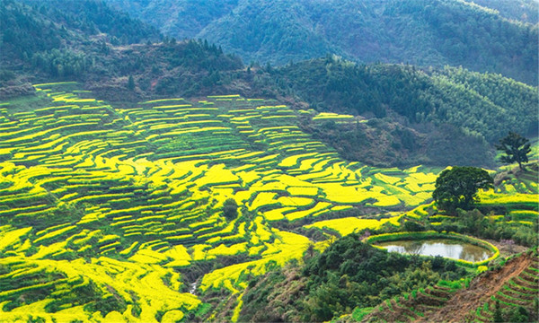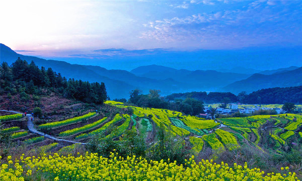 篁岭古村周边千棵古树环抱、万亩梯田簇拥,四季花海展示惊艳的"大地艺术"。