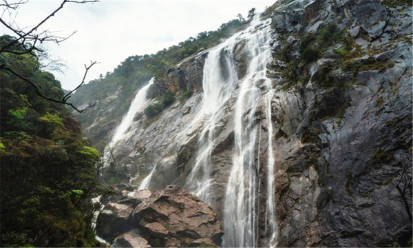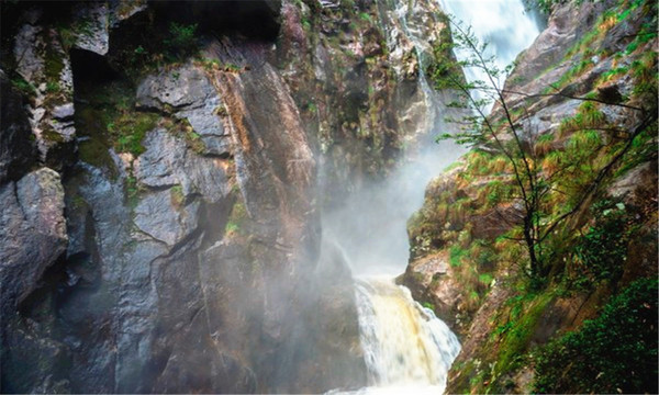 卧龙谷长3公里河段,天然落差730米,急流汹涌,峡谷幽深,危崖峭壁;奇:谷内瀑布众多,千丈瀑从落差193米高处的悬崖绝壁凌空倾泻,属国内第二高瀑秀。