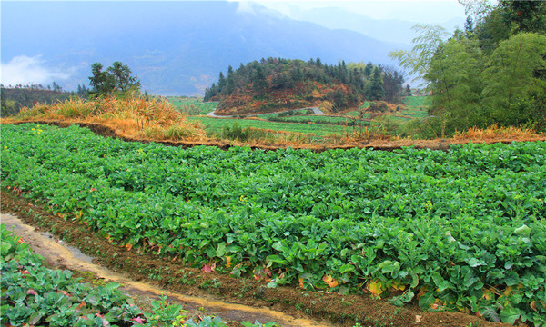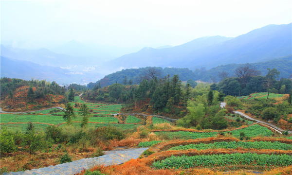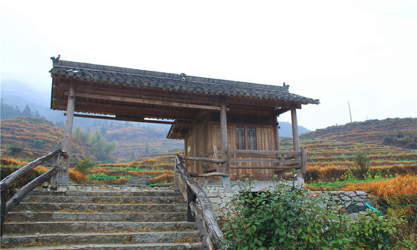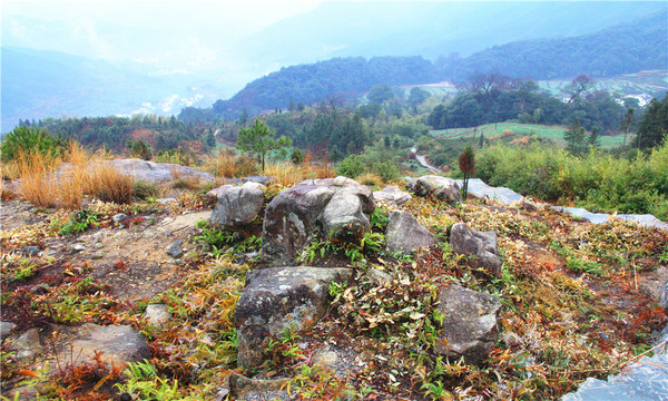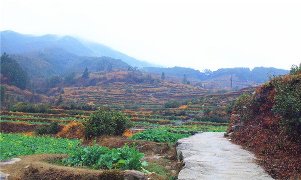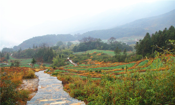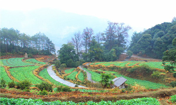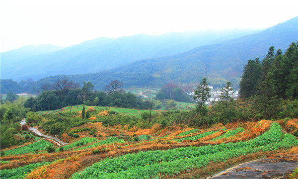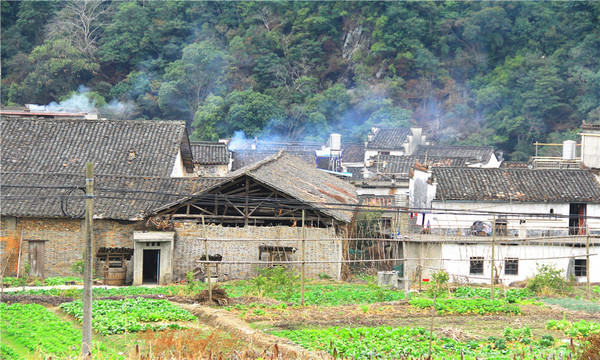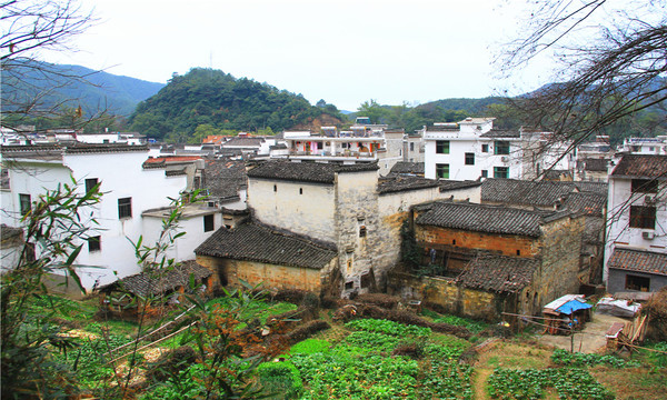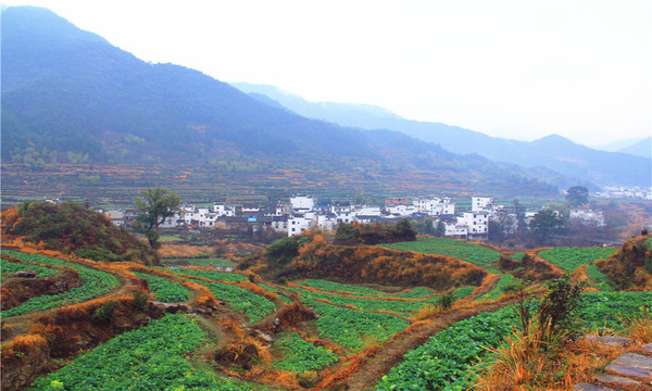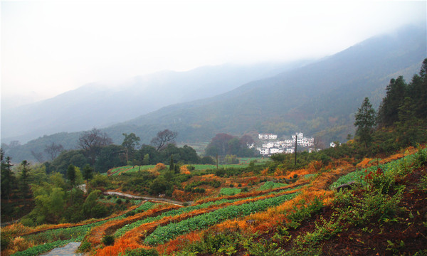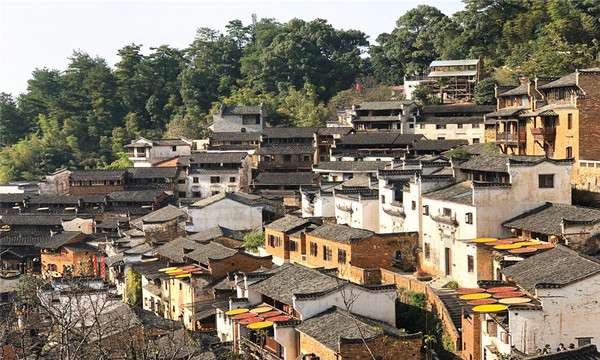 篁岭属典型山居村落,民居围绕水口呈扇形梯状错落排布。