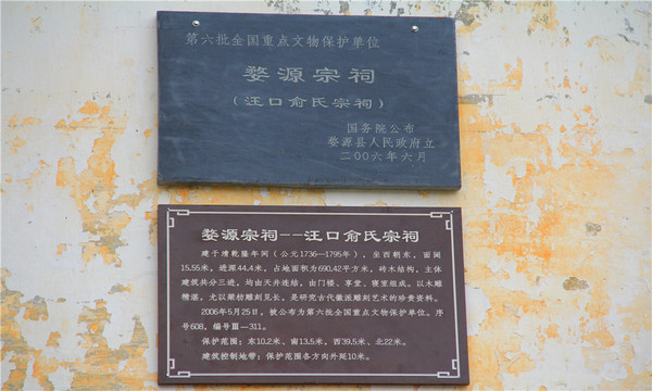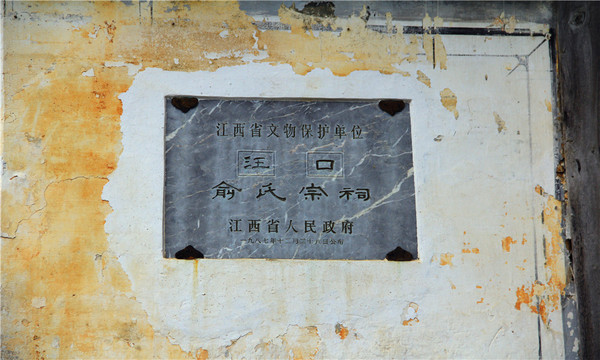 俞氏宗祠位于婺源县东北28公里的汪口村,由朝议大夫俞应纶(正三品)入宫后省亲回乡时捐资兴建,是一所以细腻的木雕闻名于世的祠堂,现为江西省文物保护单位。