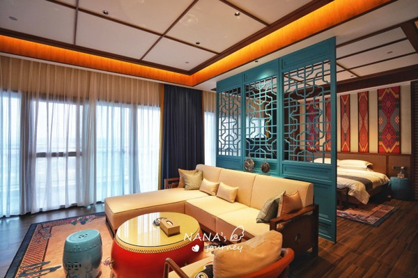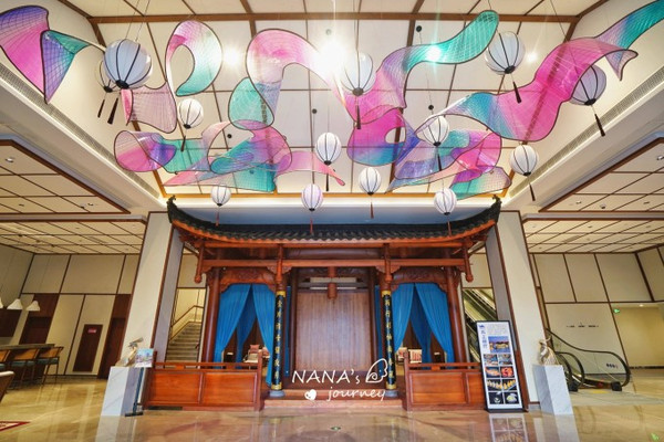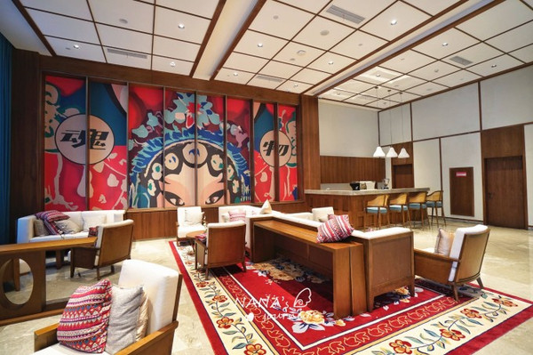 酒店虽然是现代酒店设计,但是细节里处处都包含着国风的特色,戏台、国潮背景,都融入在了环境之中。