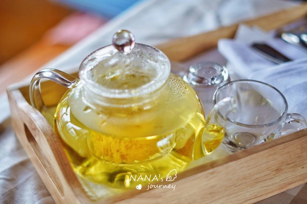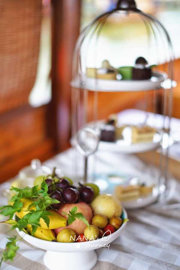 跟着船的微微晃动,我们也开始一躺古韵味的下午茶,也是很独特的一次体验。暖暖的花茶,新鲜的水果,甜蜜的蛋糕,可口的零嘴,吹起微风,荡起水花,换个角度欣赏婺女洲的美。