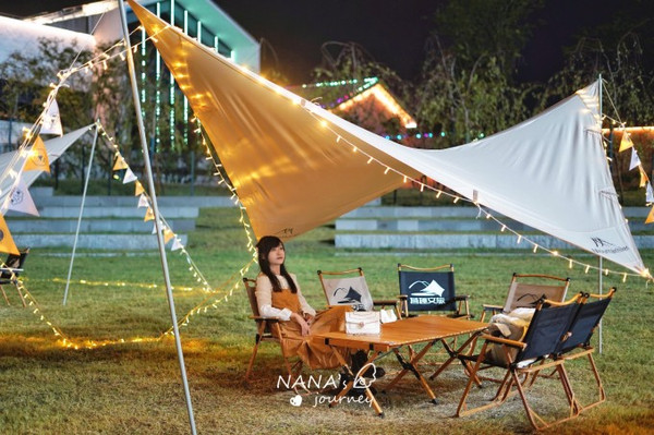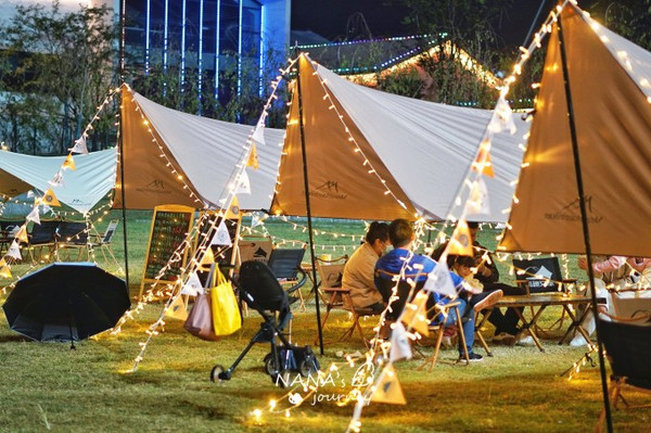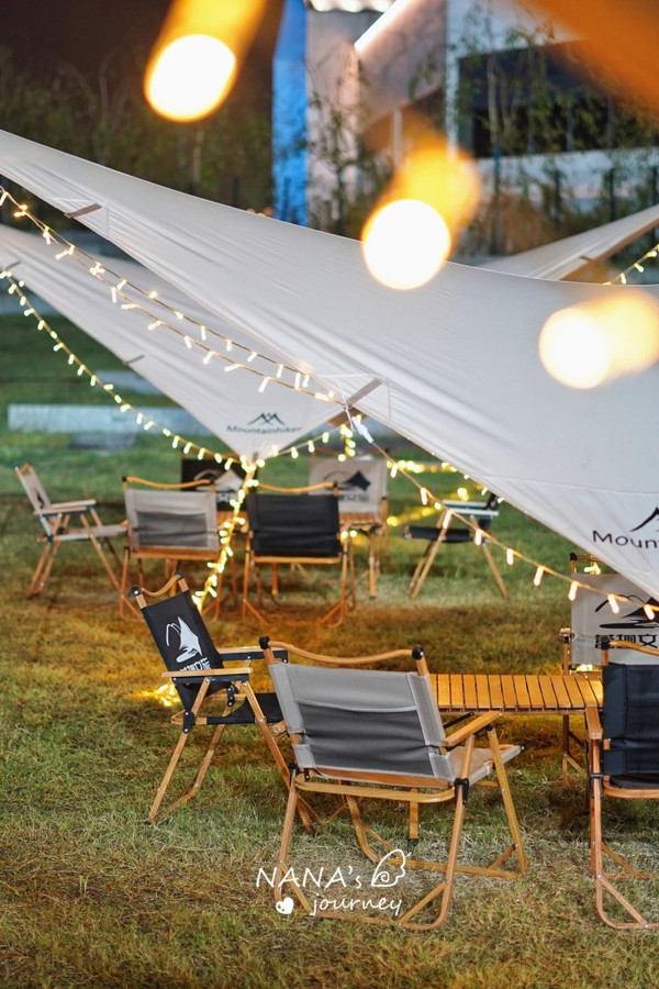 便利露营,到点就能开始露营,露营地中间有提供餐食和饮料的售卖,非常方便,帐篷都是现在流行的天幕帐篷,灯挂着非常好看,拍照绝美~