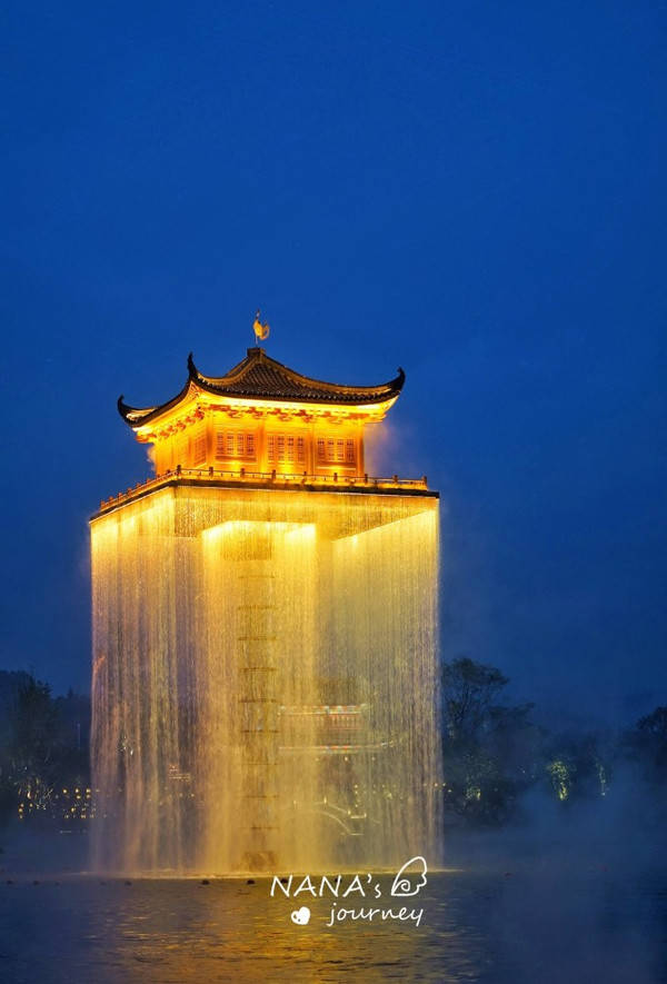 除了徽市街,傩舞广场的夜景最为大气而美丽,一眼望去的金阁,在五显湖中央,挂着水幕。