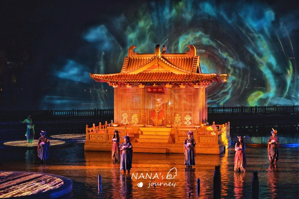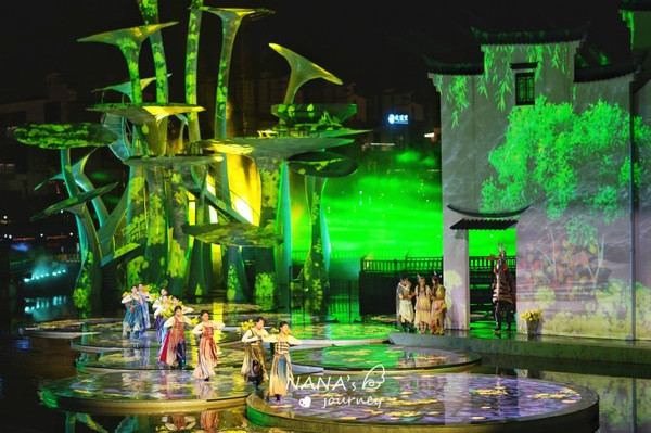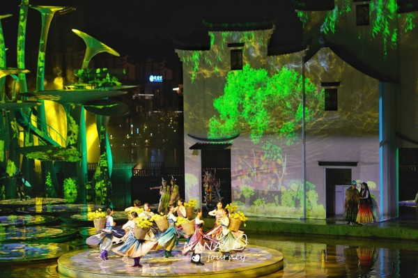 整个表演是实景演出,徽派建筑的乡村,特色油菜花,河湖中的摇橹船、3DMapping秀、水幕光影秀,让我们仿佛参与在这个上古的故事中,感受 婺源 的各种风情。