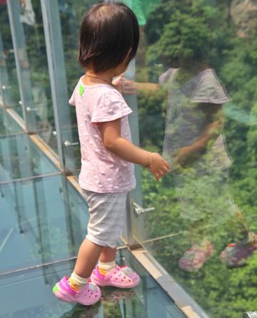 你可能会遇到这样的场景:一个肌肉男在女朋友的搀扶下战战兢兢一路吼叫的止步在玻璃栈道的半路,倒不如图中那位小女孩,毫无畏惧感地从头至尾走了下来……