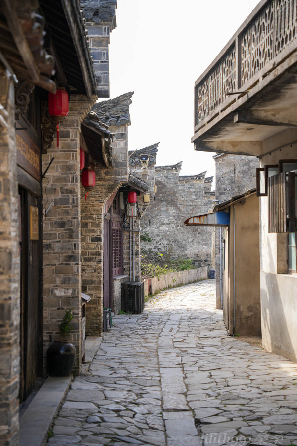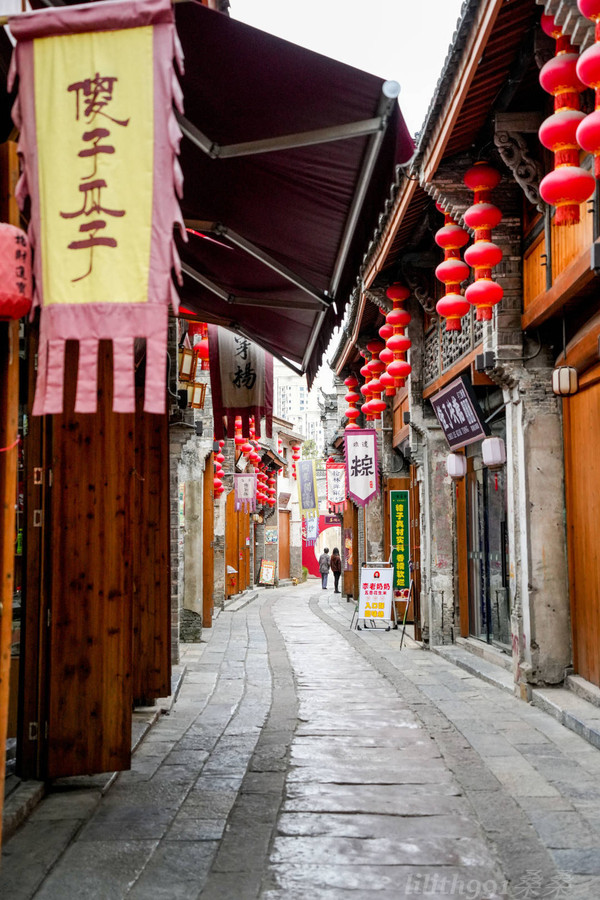 街心是青石路面,曲折蜿蜒约 1200米,街道南北走向,宽窄不匀,一般为2一3米,两旁店铺门面飞檐对峙。