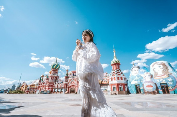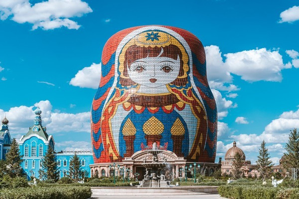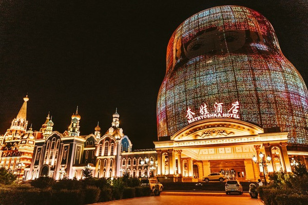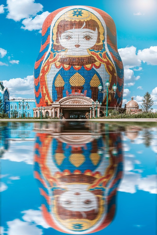 广场上最引人注目的是一座超大的套娃,里面是酒店,欧式风格的建筑底座、中心通透的内部结构,外观萌态十足,内饰精美别致,堪称世界最大的套娃主题建筑。