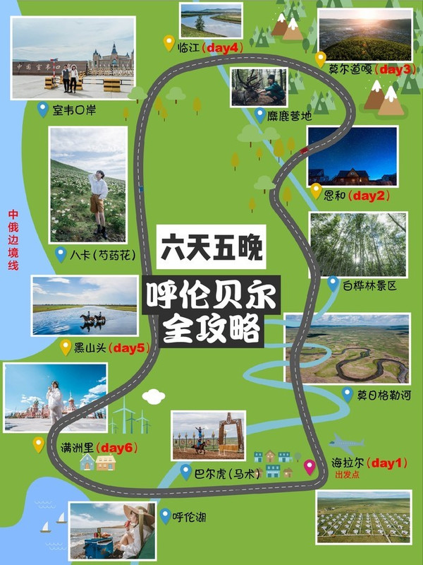 Day5:( 黑山 头 - 满洲里 )早餐过后,途径【186彩带河】全 呼伦贝尔 最长花草跑道,中间还有减速带,不然要飞出去,一定要体验。到了【 满洲里 】,先去【呼伦湖】搭个帐篷,吃个浪漫午餐。看国门,猛犸公园,套娃广场, 满洲里 这个城市最适合慢悠悠瞎逛。一路上有很多 俄罗斯 进口商店,可以买酒买巧克力,不方便带还能喊老板包邮。晚上看 满洲里 夜景,政府统一了灯光色彩,用心了。晚餐大鱼大肉(两壶1.5L鲜卑源原浆,回房秒睡)。