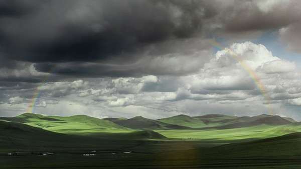 乌 云和 蓝天交替之处,连接它们的正是一道彩虹桥。巴图见怪不怪:“在我们大草原,这样的景象就是家常便饭了。”