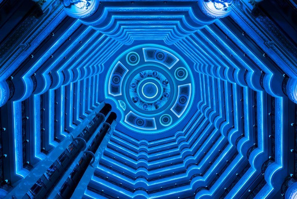 套娃酒店的内部夜晚自带魔幻气息,灯光不时地变换着颜色,恍惚间有一种走进了9层妖塔的感觉。