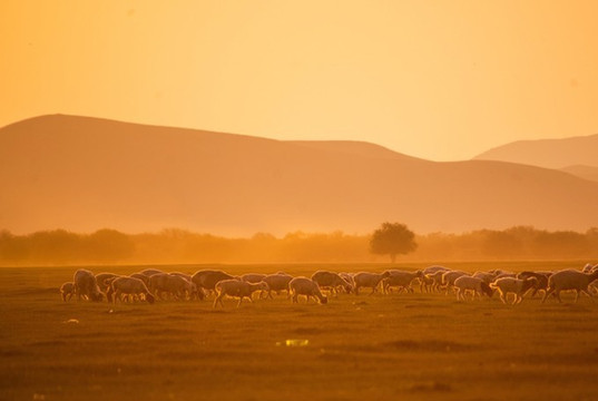 日落时分妈妈看到一群羊,激动的让巴图领队在路边停车,下去一顿狂拍。