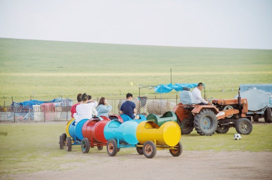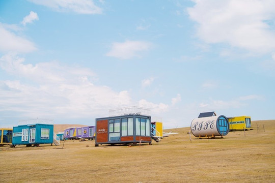 今天的线路是穿越草原,一路上有点颠簸,好在窗外风景不错。路过一家草原集装箱酒店,五颜六色的小房间十分好看,估计因为疫情原因停业了,不然住上一晚也是不错的。
