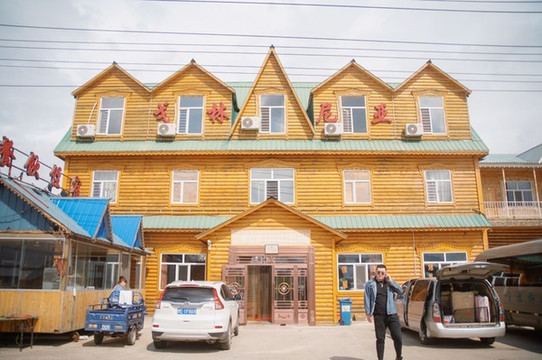 晚上我们住在巴图领队家里,就是恩河镇上的这座戈林尼亚旅馆,这可是传统的木刻楞呢。