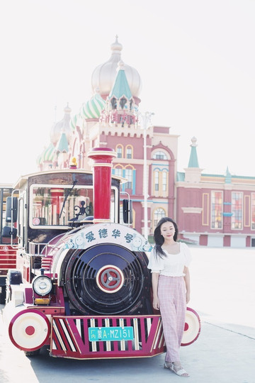 在广场外还有几辆漂亮的小火车,和妈妈过来拍几张照片。