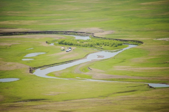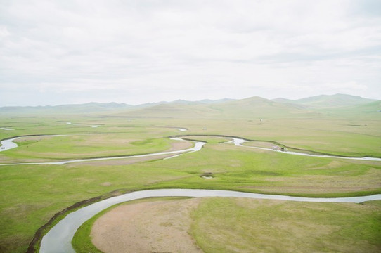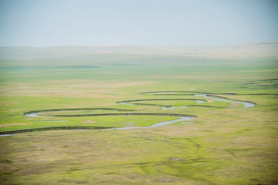 弯曲的河道勾勒出一副美丽的风景画,可以依稀看到草原上的大片羊群。