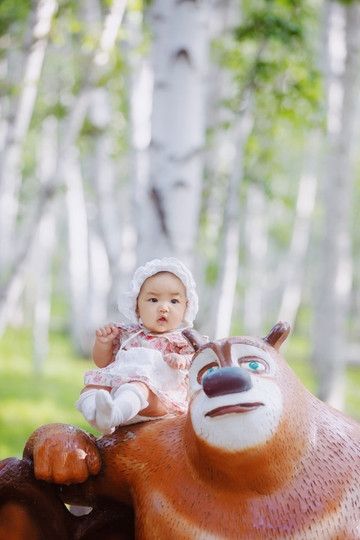 这个白桦林景区也有专门为小朋友设计的拍摄地,好多好看的道具和卡通人物,快看我和熊大拍了合照耶。