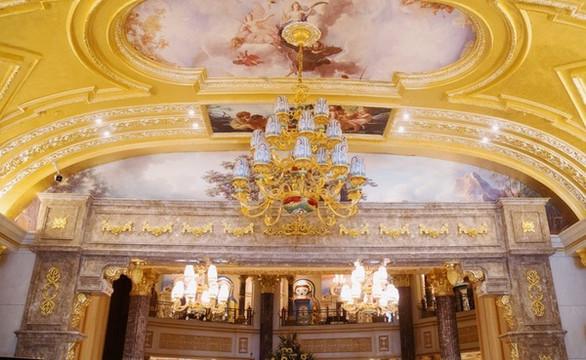 走进酒店里面,可见酒店内部金碧辉煌的装修陈设,连吊灯都是蓝色的套娃。