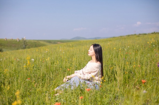 7月的大草原上开满了各种野花,宝宝第一次看到这样的场景激动坏了,什么都想用嘴巴去试试味道。