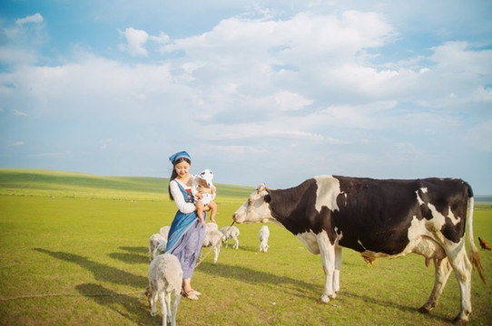 妈妈特意给我穿了奶牛装和大奶牛合影,可羊羊也跑来凑热闹。
