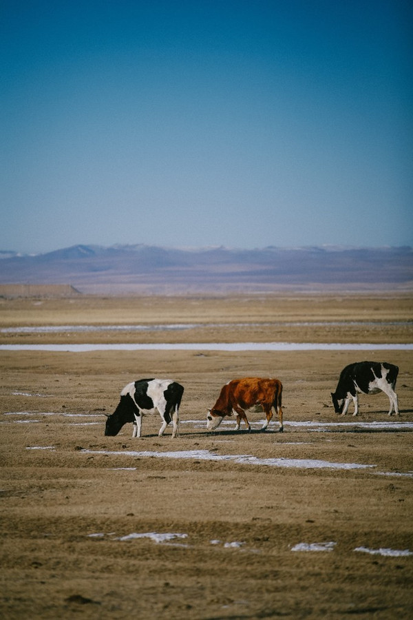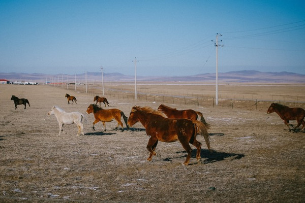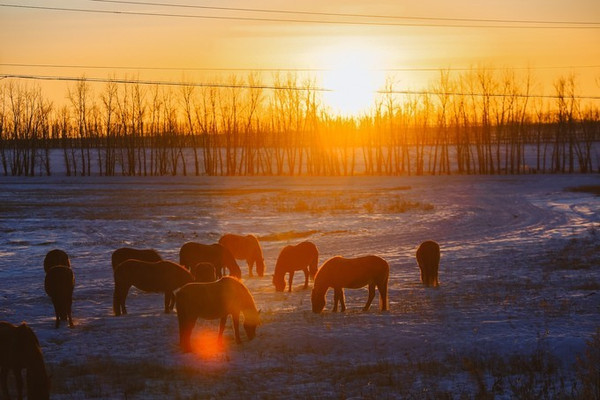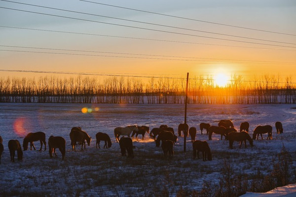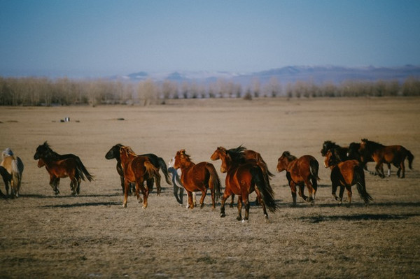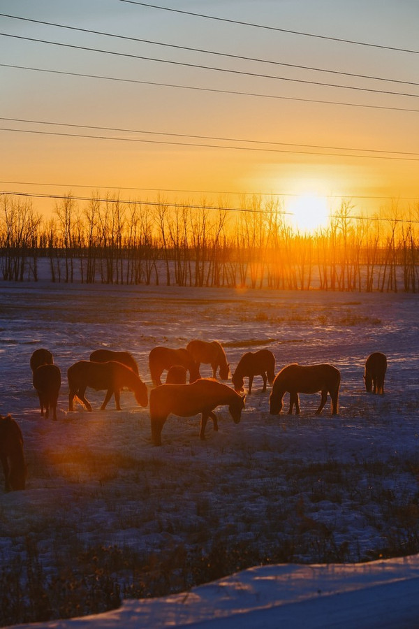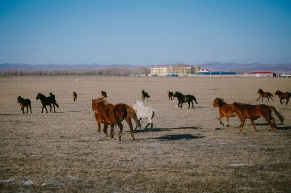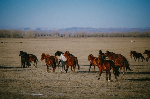 冬天许多羊群、马群都被牧民们赶到统一的地方圈养起来了,能碰到这样一群还在大草原上散养着的,也是很幸运嗷~