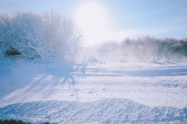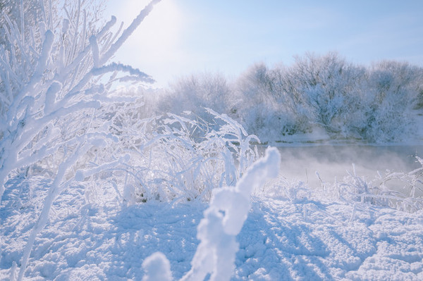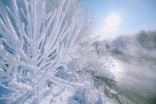 河两岸的树上,由于河水蒸汽的作用,会结上一层厚厚的冰晶,也就是大家常说的雾凇。