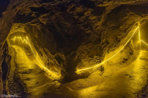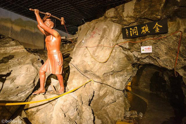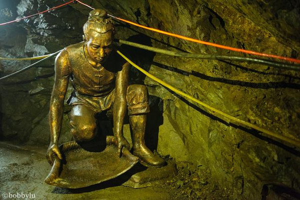 这里的金洞入口就坐落在黄金文化展馆内,相信多数游客一定和我一样,还没细看黄金开采的历史及冶炼文化,就已经迫不及待的找寻金洞的入口了,在展馆的尽头,就可以看见金洞的入口。洞口不大,可两人并排进入,但行走却不容直身。金洞狭长而潮湿,俗话说,“金生水、水养金”,洞顶随处水滴不停但不至于打湿衣服。