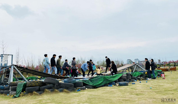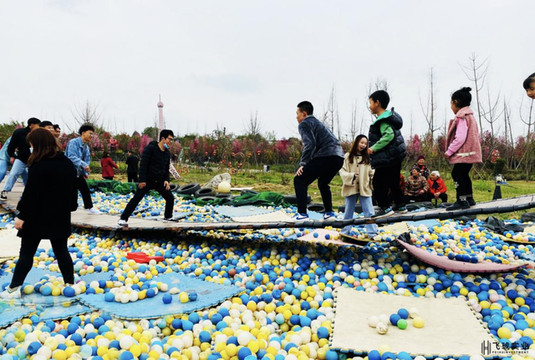 左边有一座大大的娱乐荡桥,每个人从两端小心的爬上去,一起喊着节拍左右摇晃,在惯性地带动下,桥身很快自然地摇摆起来,气氛顿时达到了高潮,人群欢笑声响成一片。