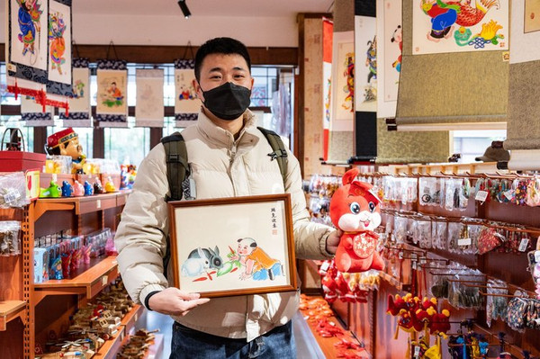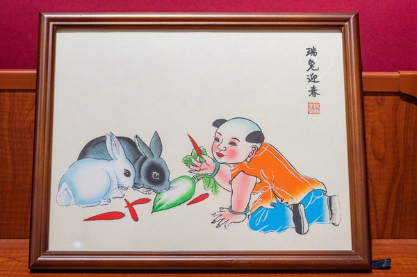 来绵竹年画村,一定要参观绵竹年画展示馆,在这里可以了解到最全、最丰富的绵竹年画。据说绵竹年画起源于北宋,有着色彩鲜艳明快,线条古拙流畅的特色,辨识度很高。与剑南春酒、赵坡茶并称为“绵竹三绝” 。在展示馆里我也找到了一幅瑞兔迎春,主题很符合即将到来的兔年,兔年也是我的本命年,那必须要合影一张啦!
