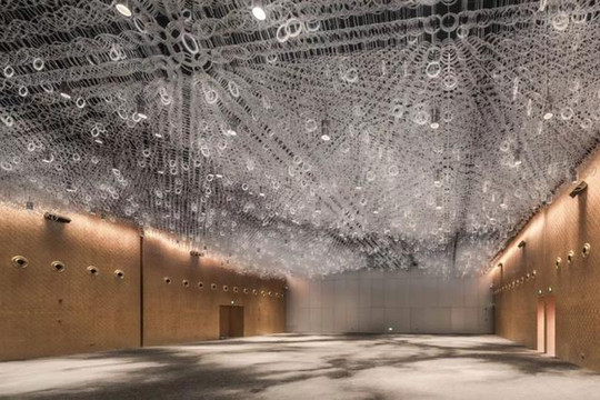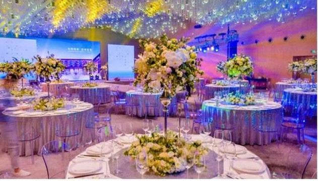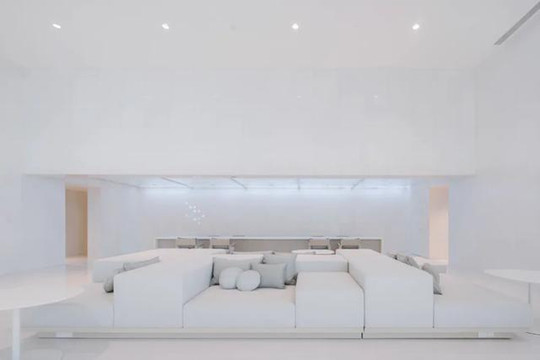 宴会厅门厅纯白简约素雅,透过光影与彩色玻璃的交替传递,律动感十足。步入以亚克力水晶铺满整个天花的宴会厅,抬头似巨大的云朵,低头是光影投射到地板上的天空雏形。