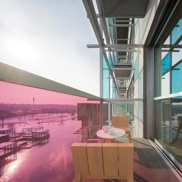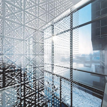 远看错落层叠,近看无数块拼接整齐划一的彩色玻璃迷幻了凝视者的视线。在白天晴朗的阳光之下,彩色的玻璃折射出彩虹般斑斓明丽的色彩,让人们呆在酒店里也能沐浴一个别开生面的“日光浴”。