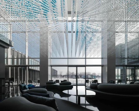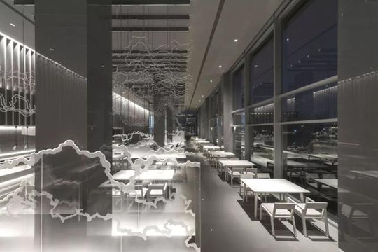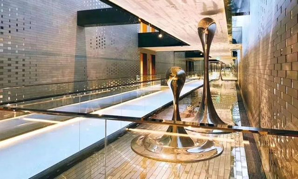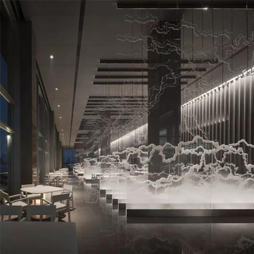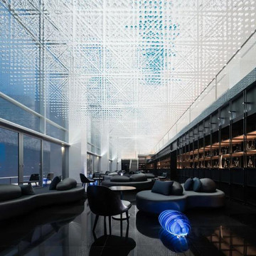 行走其中,仿佛进入了纯粹又神秘的世界,大堂吧的沙发及亚克力灯饰,与水晶装置相呼应,宛若雾化成水,滴落在地面,于是水流淌开来,蜿蜒在大堂吧。