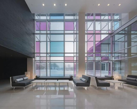 清晨交织的金黄、橙红;午后明亮的湛蓝;夕阳西下浪漫的红以及逐层过渡的紫,设计师Amata将这些色彩在经过模糊处理后,彼此交织共同构成了建筑的外立面。