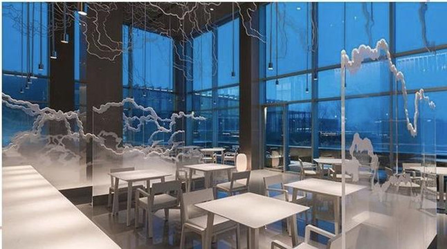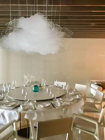 在酒店的全日制餐厅“雾中花餐厅”和中餐厅包房,设计师干脆把云降在了这里。片片白云,被制造成了灯饰,被设置成了隔挡屏风,一片片艺术的云,冲击了视觉,也丰富了空间。