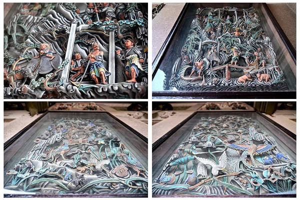 四幅青石挂屏,分别是士农工商、渔樵耕读、鱼虫花鸟、百鸟朝凤,独特的镂空雕刻技艺,工艺难度极大,有“一条石牛绳气死三个打石师傅”的典故。结构立体层次分明,栩栩如生惟妙惟肖,真是精妙绝伦。