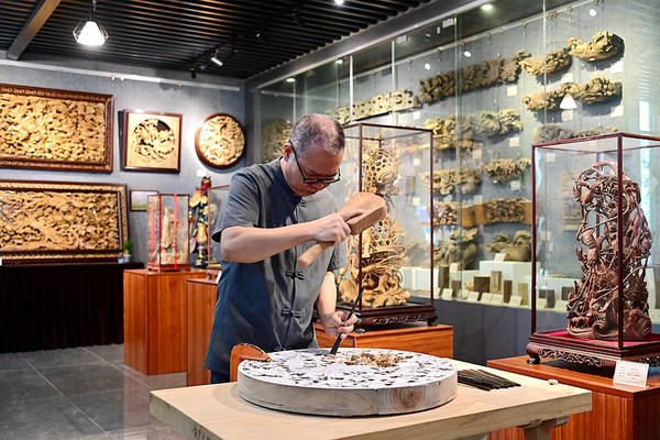一进门就木香扑鼻,原来是樟木的香味,师傅们正在全神贯注聚精会神的雕刻着木雕。